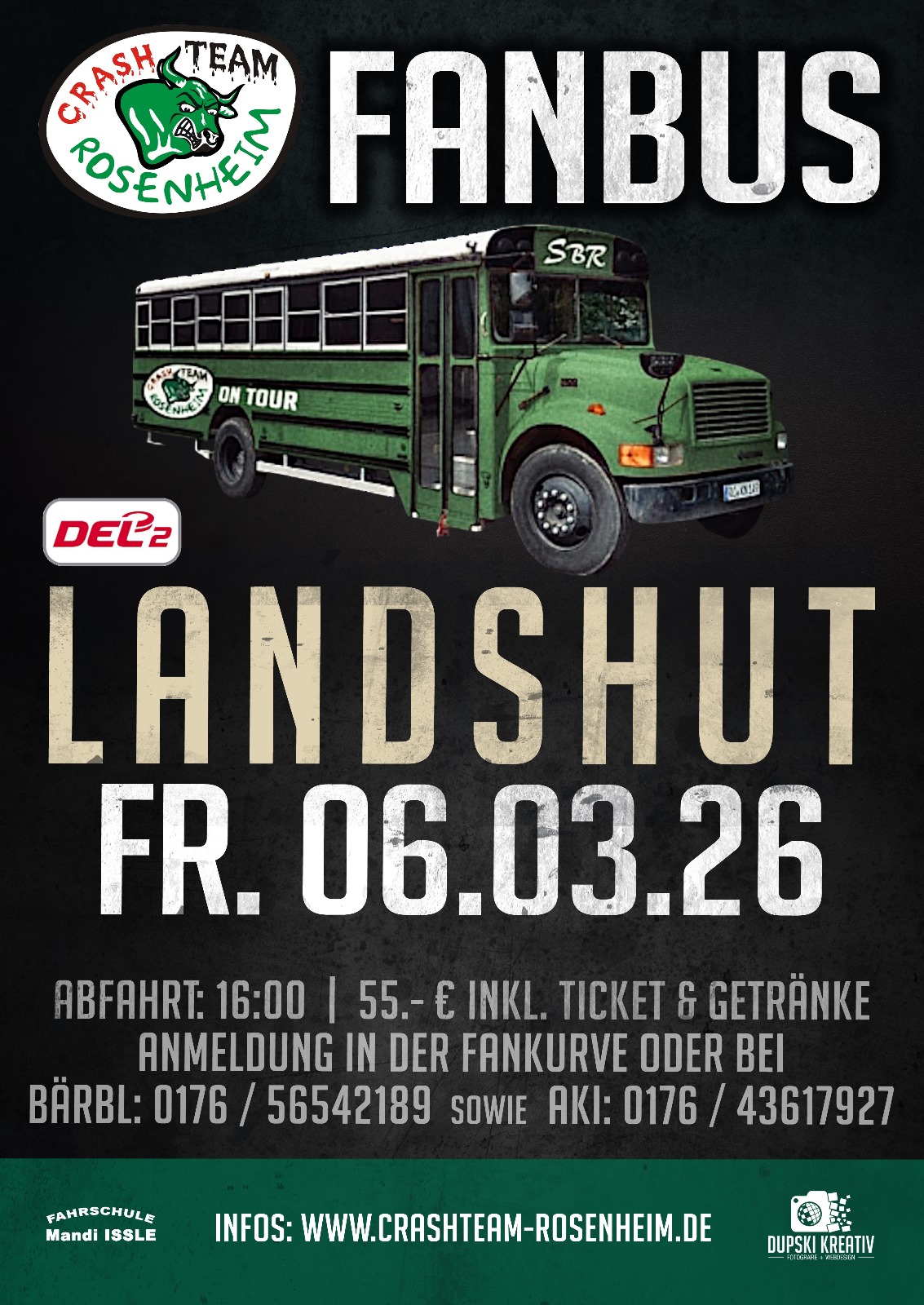 Auf geht mit dem Bus nach Landshut Fr., 06.03.2026 Abfahrt: 16:00 Uhr ab Rofa Stadion Preis: 55,00 € (inkl. Karte und Getränke im Bus, keine Brotzeit!!!) Anmeldung beim Crashteam in der Fankurve und bei Bärbl: +4917656542189 oder Aki:...